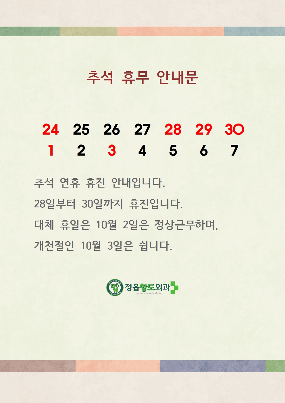 공지사항 2023년 추석 휴진 안내 작성자 taun2 작성일 2023-09-27 16:37 조회 370 2023년 추석 연휴 휴진 안내입니다.28일, 29일, 30일 휴진하며, 10월 2일은 정상근무. 10월 3일 개천절은 휴진입니다.감사합니다. 좋아요 0 싫어요 0 인쇄 « 정읍아산병원과 협력병원 협약을 체결했습니다. 2024년 새해 복 많이 받으세요. » 목록보기 답글쓰기 Powered by KBoard